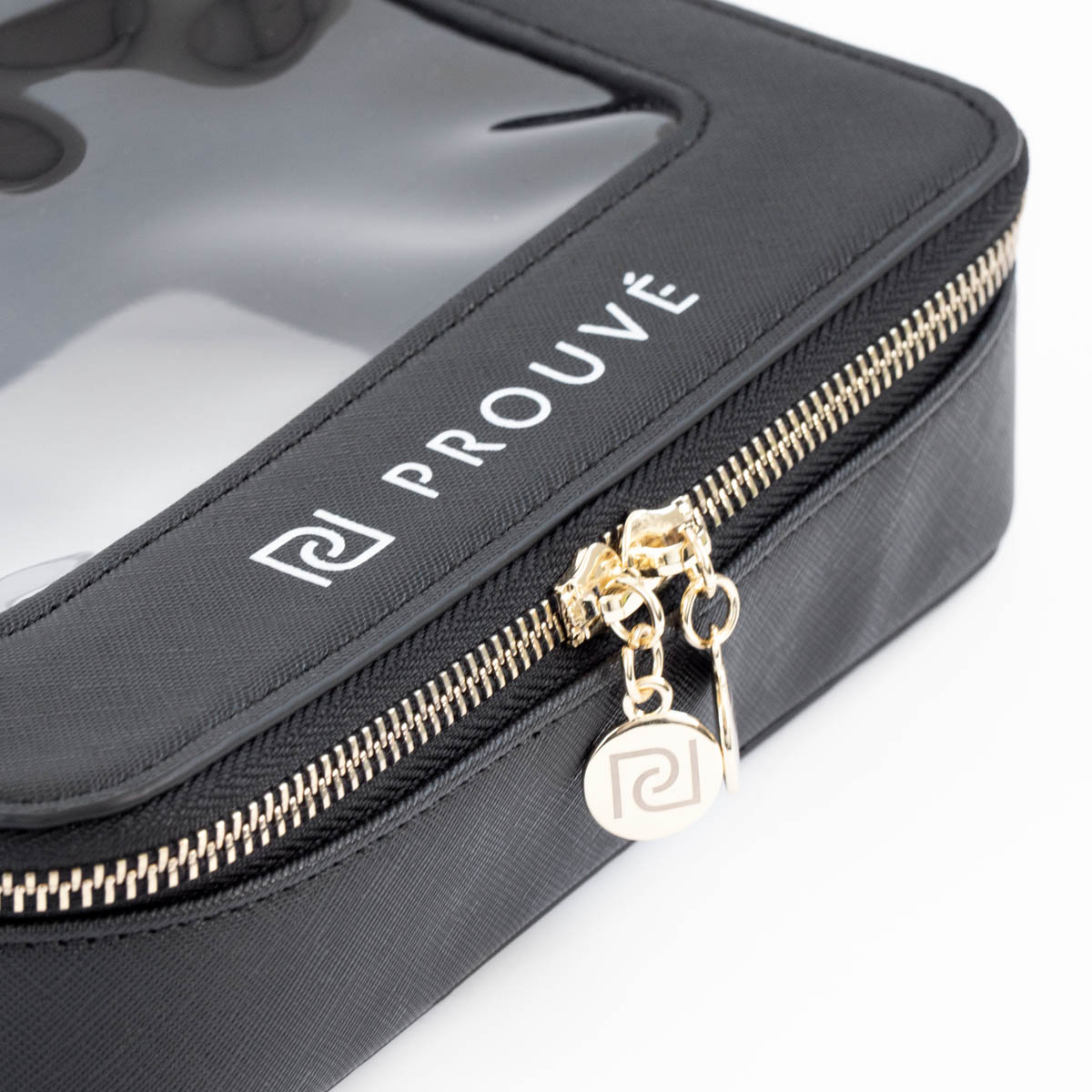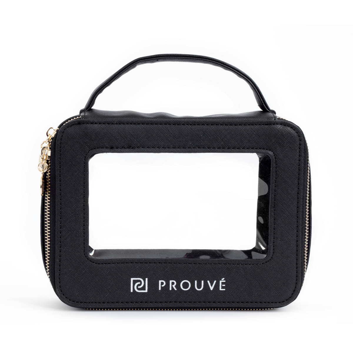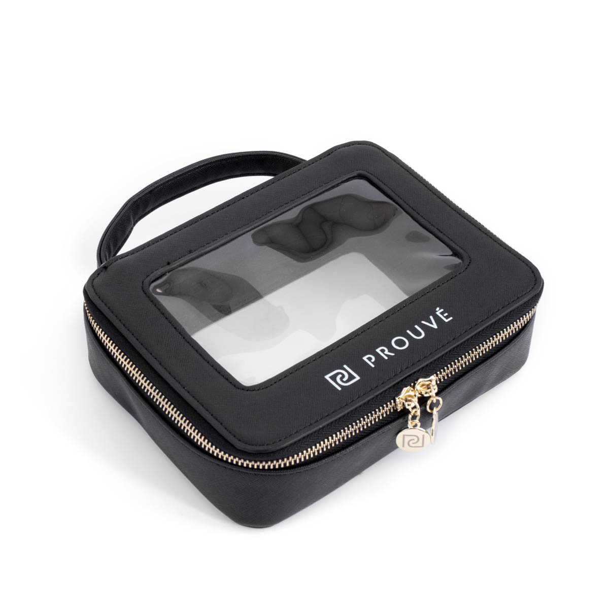 O borsetă pentru produse cosmetice, elegantă și spațioasă, cu fereastră transparentă și mâner confortabil pentru transport. Închidere cu fermoar.
